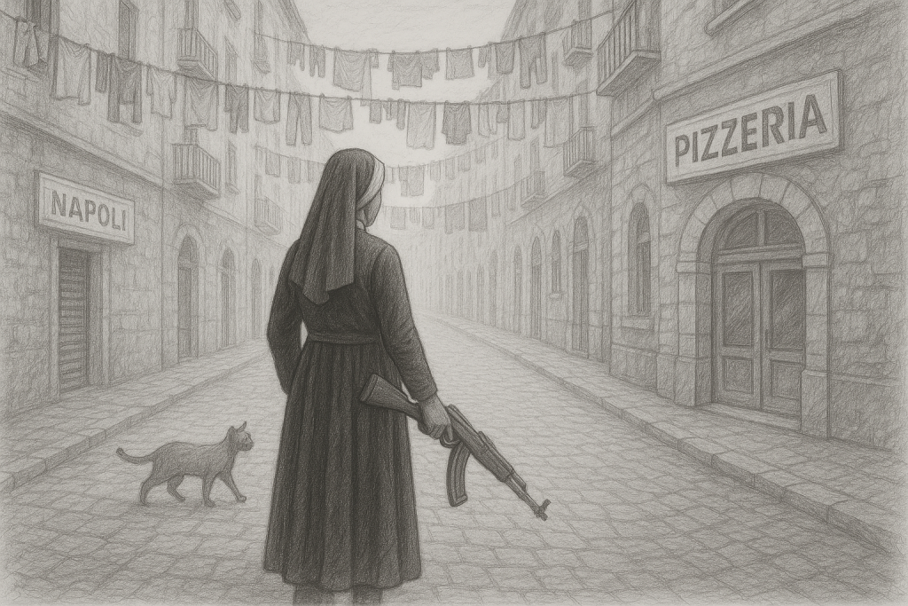 “It says here that pizzerias in Naples are terrorised by groups of nuns demanding free food with menaces.”